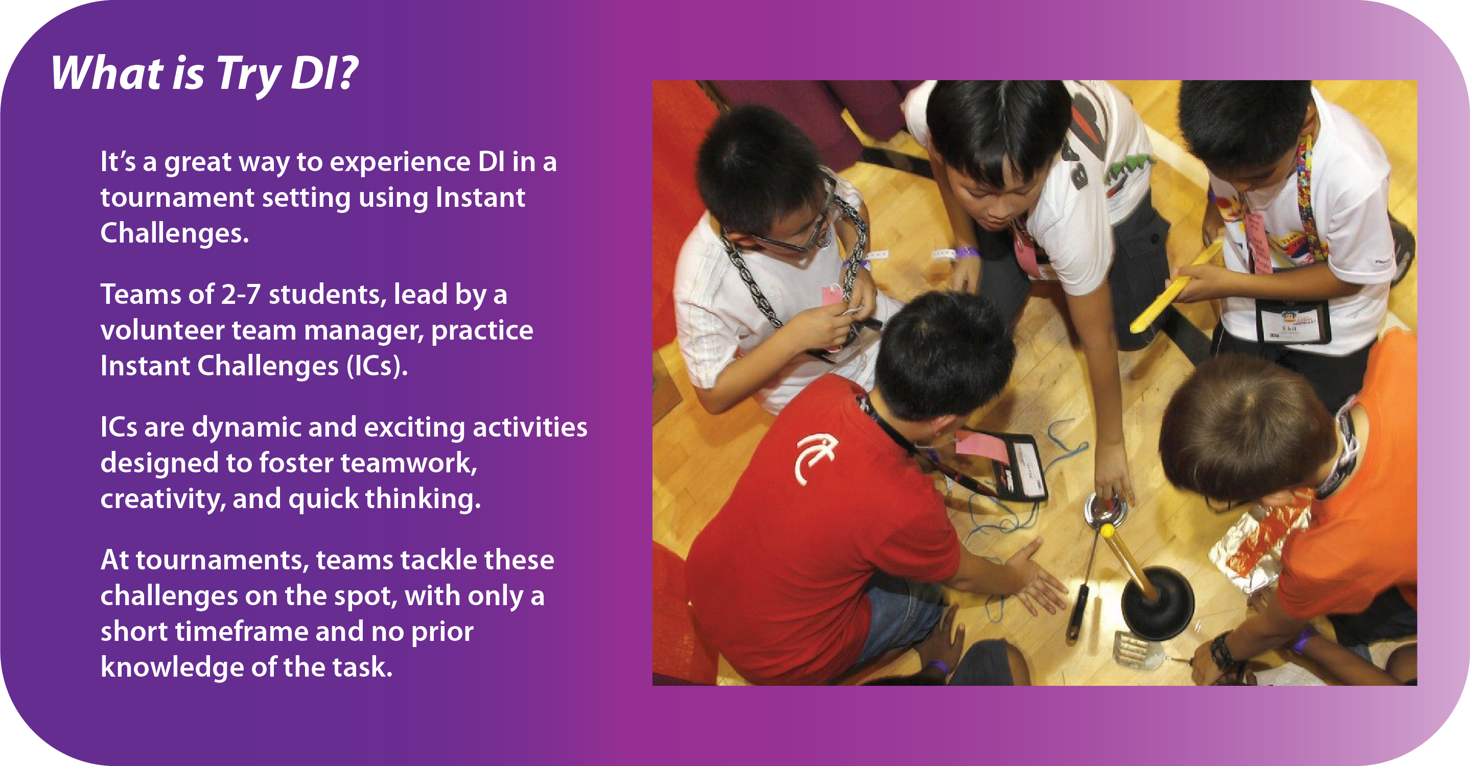 To START a fast-paced introduction into the Destination Imagination Challenge Experience all you need to do is form a team of 2-7 kids with a volunteer team manager and sign-up!